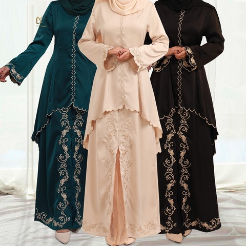 Truyền Thống Hồi Giáo Quần Áo Thêu Malaysia Rắn Màu Baju Kurung Hồi Giáo Hai Mảnh Thiết Lập